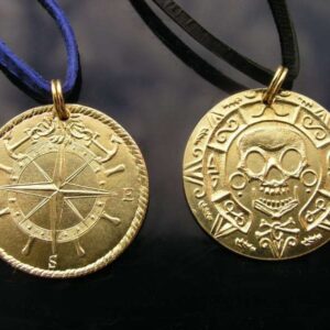 Novoražba autorské mince s pirátským motivem v barvě zlata. Přívěsek na kroužku s koženým řemínkem v modré nebo černé barvě barvě (barvu řemínku si vyberte a uveďte, prosím, v objednávce). Na jedné straně je lebka s ornamentem a skříženými hnáty, na druhé straně směrová růžice v kormidle a dvě kotvy. Materiál a rozměry: masívní mosaz…