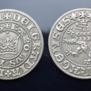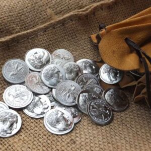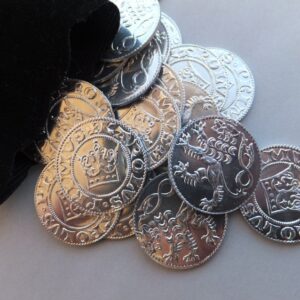 Stříbrný poklad pro malé piráty a rytíře – středová část repliky Pražského groše Karla IV. Mince zobrazují svatováclavskou korunu s opisem a českého, dvouocasého lva. Jsou raženy do hliníku z raznice, vyryté klasickou, středověkou technologií. Průměr 20 mm, síla 1 mm. Cena je za 50 kusů. K tomuto nákupu Vám dáme 1 měšec zdarma. Mince nejsou vhodné…