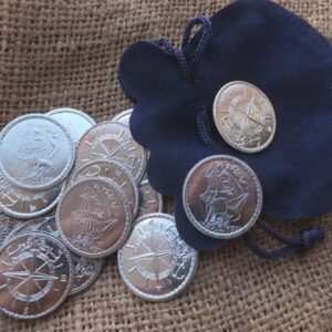 Stříbrný poklad pro malé piráty a cestovatele. Mince zobrazují pirátskou plachetnici ve vlnách a směrovou růžici. Jsou raženy do hliníku z ručně rytých raznic. Autorem je medailér Vojtěch Dařbujan. Průměr 25 mm, síla 1 mm, materiál hliník. Cena je za 20 kusů. K tomuto nákupu Vám dáme 1 měšec zdarma. Mince nejsou vhodné pro děti do 3 let.