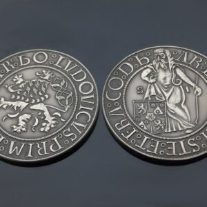 Jáchymovský – Šlikovský Tolar umělecká replika stříbrné české mince, ražená do alpaky s ruční patinou, která svou váhou i barvou dobře imituje starostříbro. AVERZ český zemský znak, okolo opis se jménem panovníka, který byl formálně vydavatelem mince: LUDOVICVS . PRIM(VS) . D(EI) . GRACIA . R(EX) . BO(EMIE), tj, Ludvík První, z Boží milosti král český REVERZ…