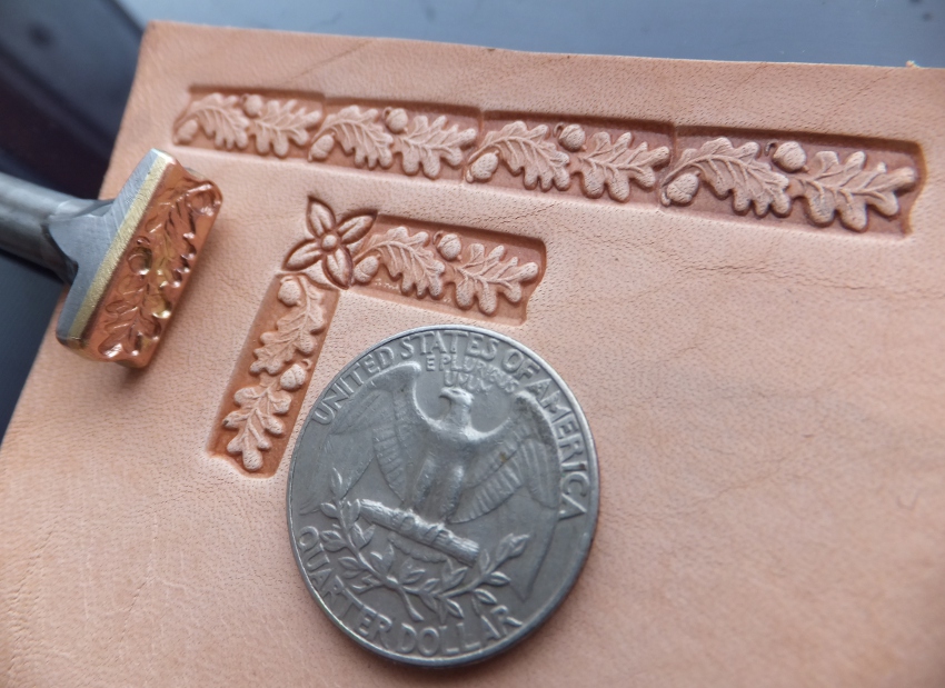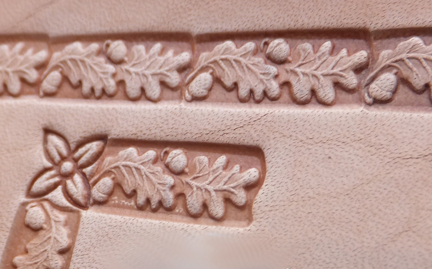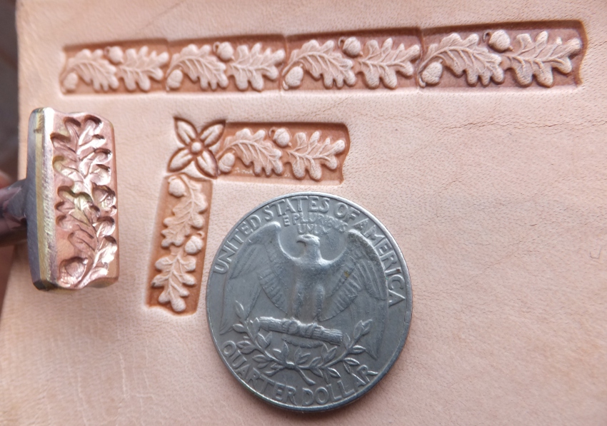 Razidlo do kůže s plastickým, motivem dubových listů o velikosti 18 x 8 mm. Jeden konec razidla navazuje na druhý a lze jím vytvářet různé linie.