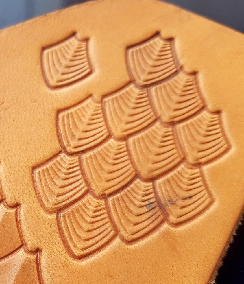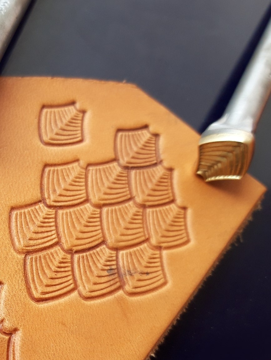 Šupina malá vrúbkovaná – raznica na ručnú razbu do kože s plastickým motívom šupiny. V opakovaní vytvára okraj alebo plochu pripomínajúcu kožu draka, hada, ryby či iných bájnych tvorov.