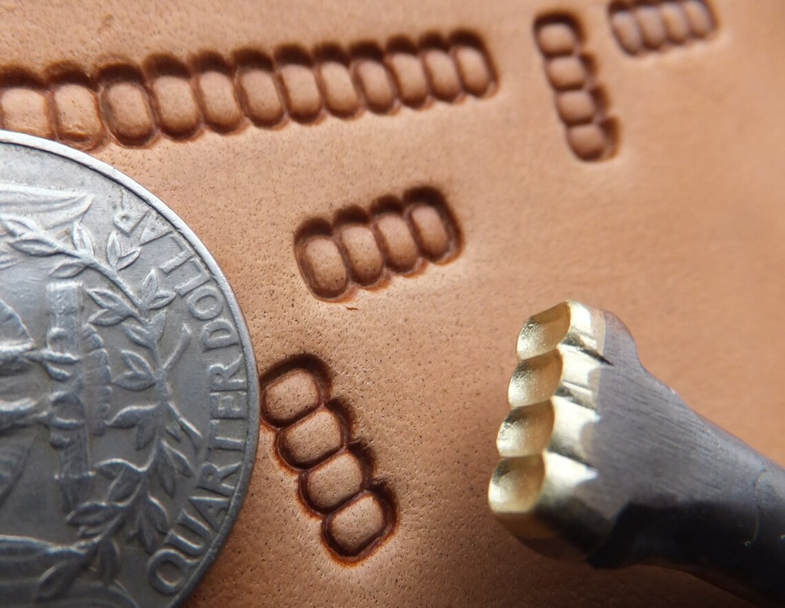 4 korálky razidlo do kůže je ruční razidlo s plastickým motivem 4 oválků velikosti 4 x 10 mm (2/16 x 3/16“), které vytváří v řadě efekt navlečených korálků. Pro Vaše tvoření z kůže, luxusní vazby knih. atd. Razidlem lze vytvářet cesty křížem krážem i hrubé zmatnění plochy.
