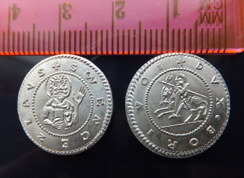 Umělecká replika stříbrné české mince z 11.-12. století. Ražba je provedena do cínu, průměr 18 mm.
