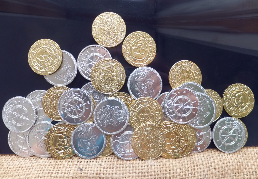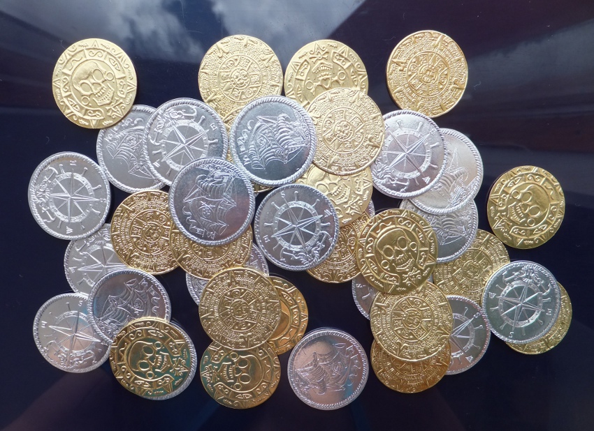 Pirátský poklad 40 ks s měšcem se Vám bude hodit ke každé cestě za dobrodružstvím. Tento „stříbrný a zlatý“ poklad jsme vytvořili pro malé piráty a cestovatele. Sada obsahuje 20 kusů hliníkových mincí stříbrné barvy na kterých vidíte zobrazenou pirátskou plachetnici ve vlnách a směrovou růžici. Dále v tomto pokladu naleznete 20 mosazných mincí zlaté barvy s pirátskou lebku a Aztéckým kalendářem. A k tomu všemu dostanete od nás jako dárek malý sametový měšec v barvě dle momentální nabídky)