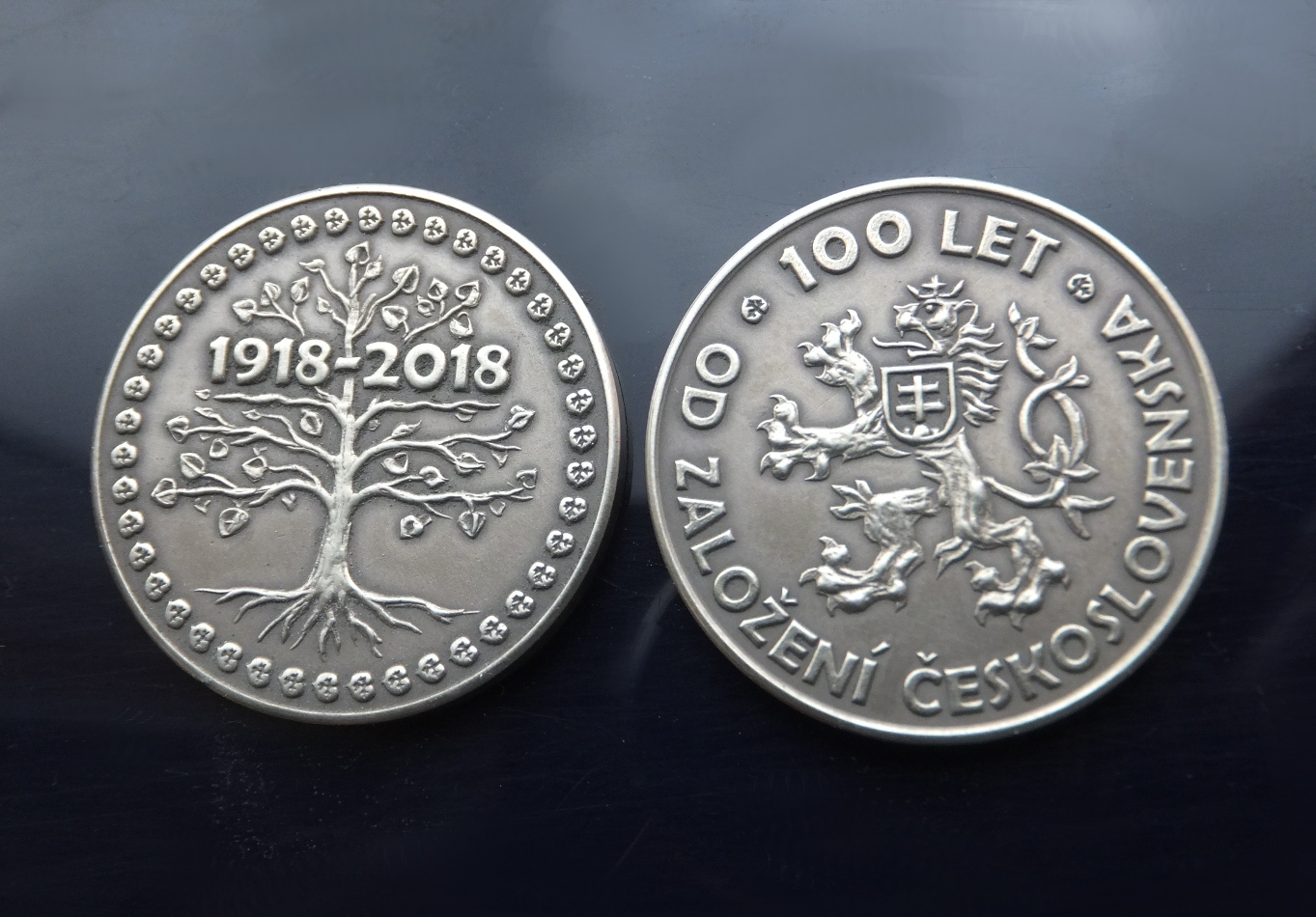 K letošnímu výročí založení Československa jsme vydali pamětní medaili v podobě prvorepublikové mince. Ražba je provedena do bílé mosazi (alpaky) a patinována na starostříbro, lakováno.