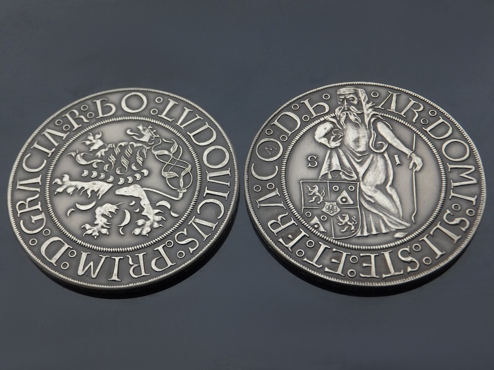 umělecká replika stříbrné české mince, ražená do alpaky s ruční patinou, která svou váhou i barvou dobře imituje starostříbro.