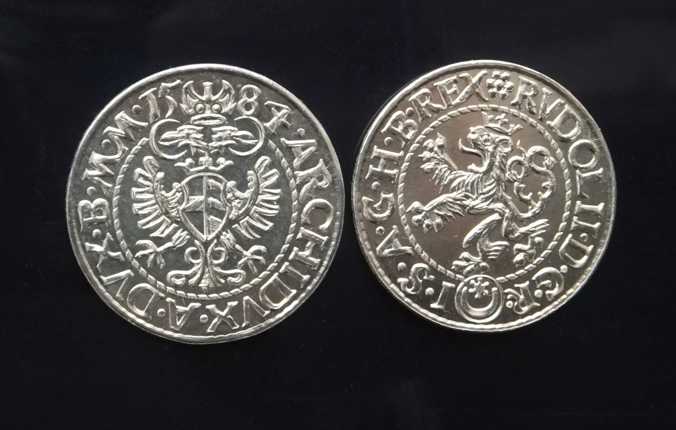 Umělecká replika stříbrné mince – platidla českých zemí z r. 1584.