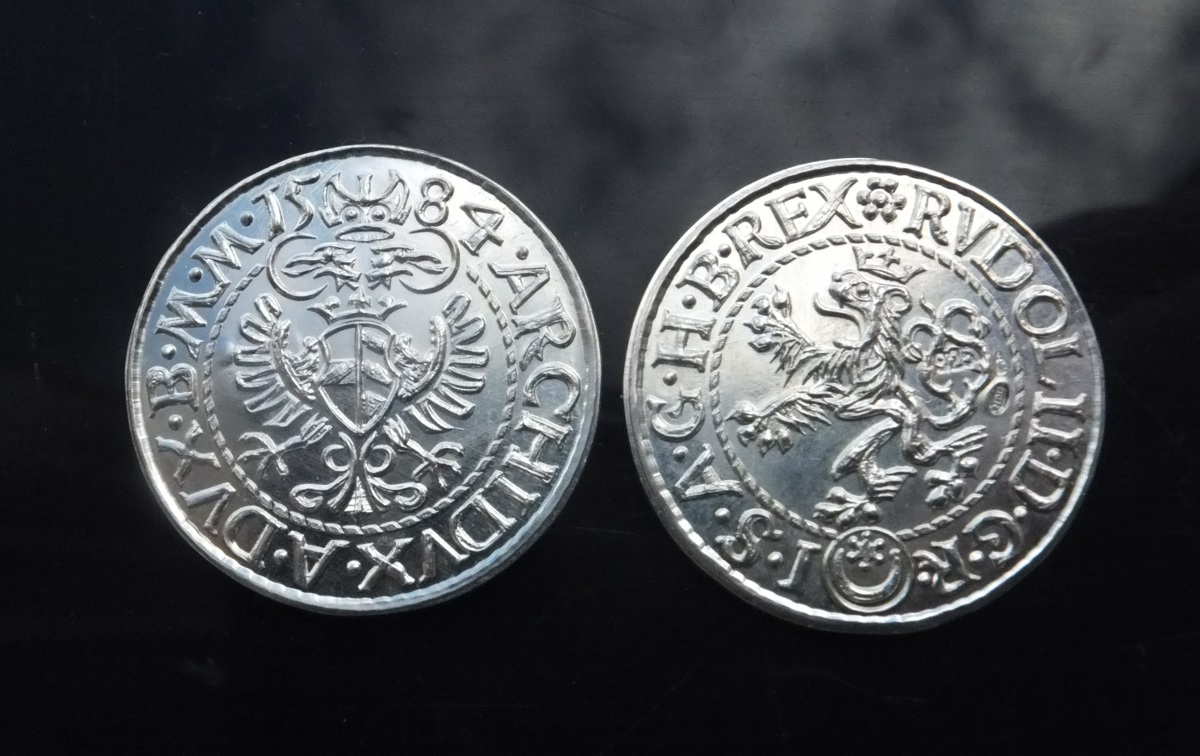 Umělecká replika stříbrné mince – platidla českých zemí z r. 1584.