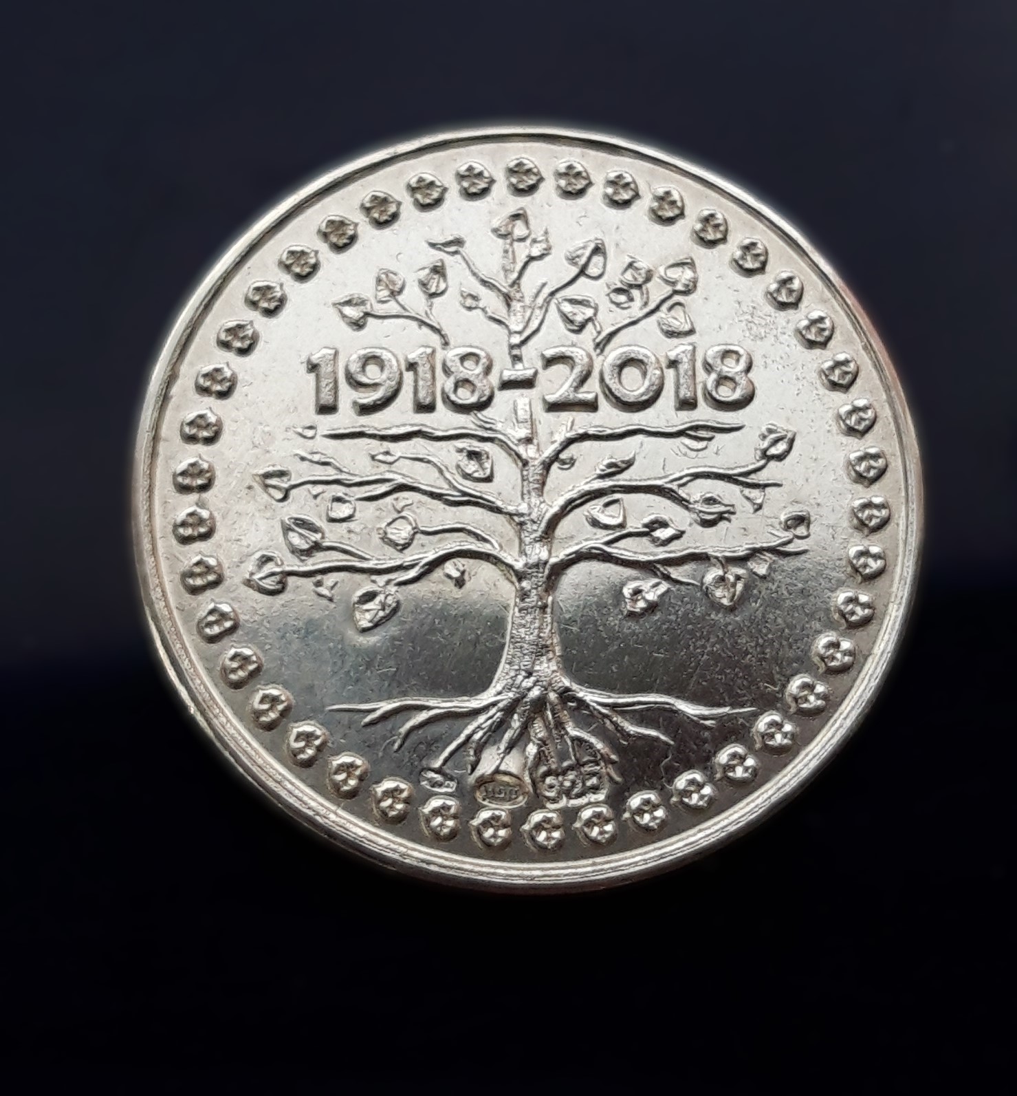 Zadní strana nese košatou lípu, národní strom symbolizující svobodu, jednotu Slovanů a demokratické hodnoty. Obvod zdobí perlovec z lipových listů, doplněný letopočty 1918–2018. Lípy se po roce 1918 staly živými památníky po celé republice.