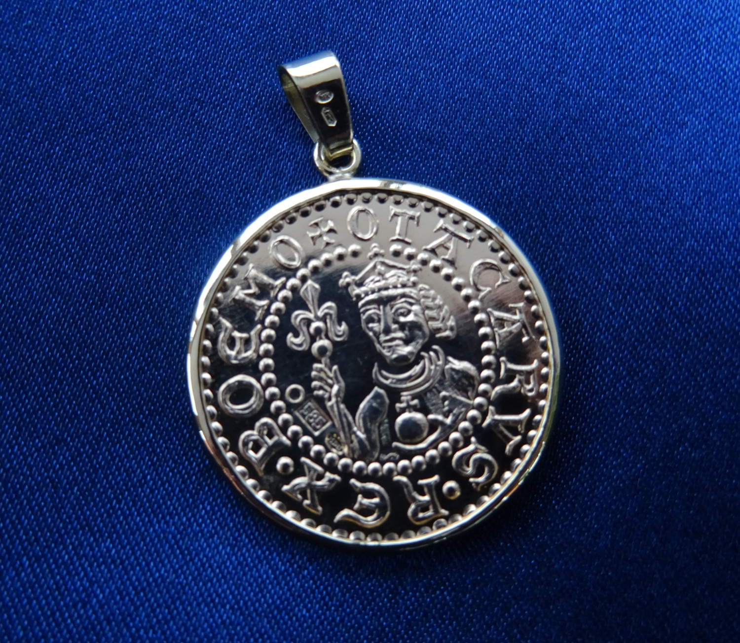 Umělecká replika unikátní české stříbrné mince, nalezené v izraelském městě Akkon, autorem je medailér Vojtěch Dařbujan.