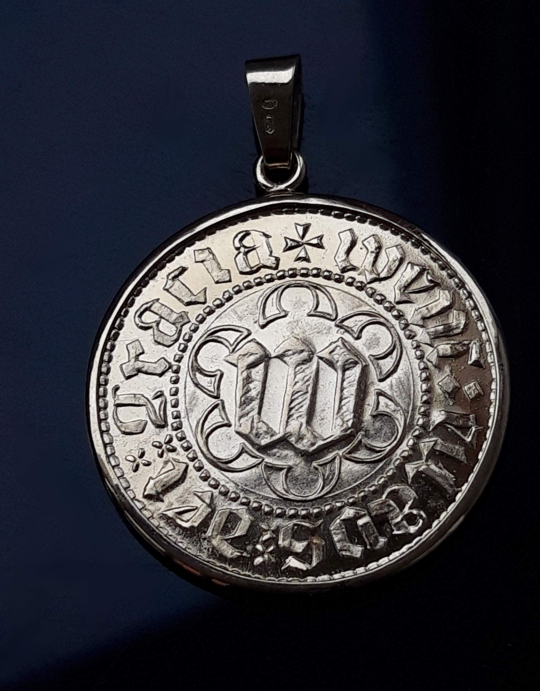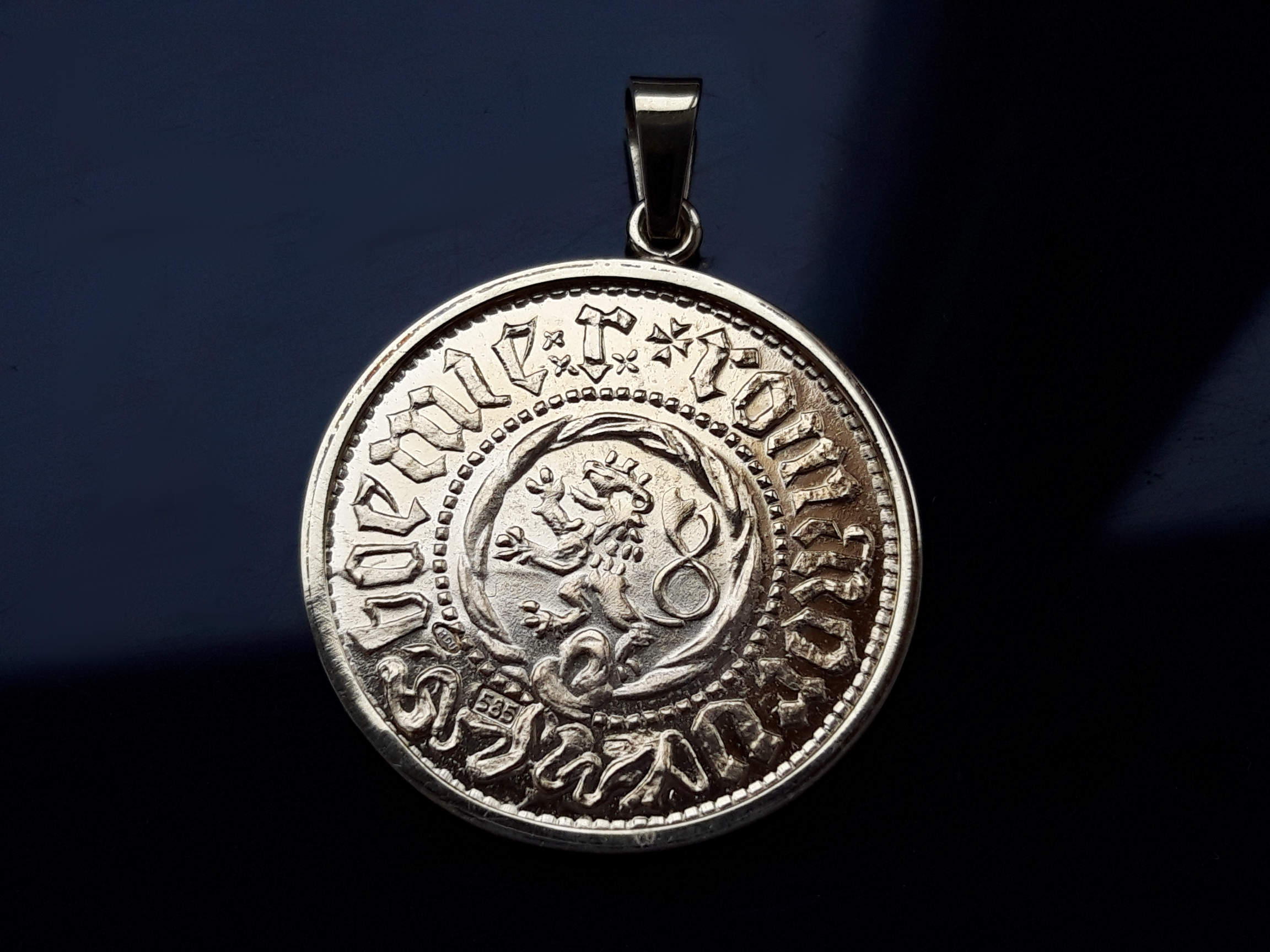 Zlatá, umělecká replika velmi vzácné mince z dob husitských Čech. Mince je zasazena ve zlaté obrubě se závěsem. Vše je precizní ruční zlatnická práce.