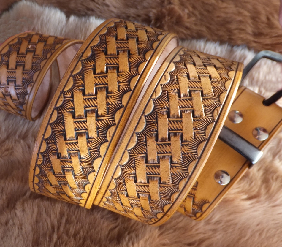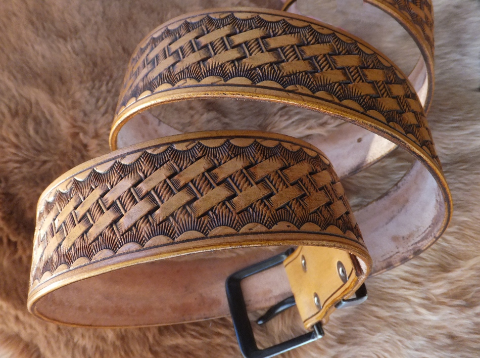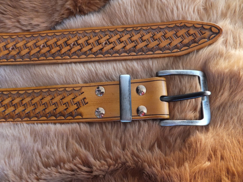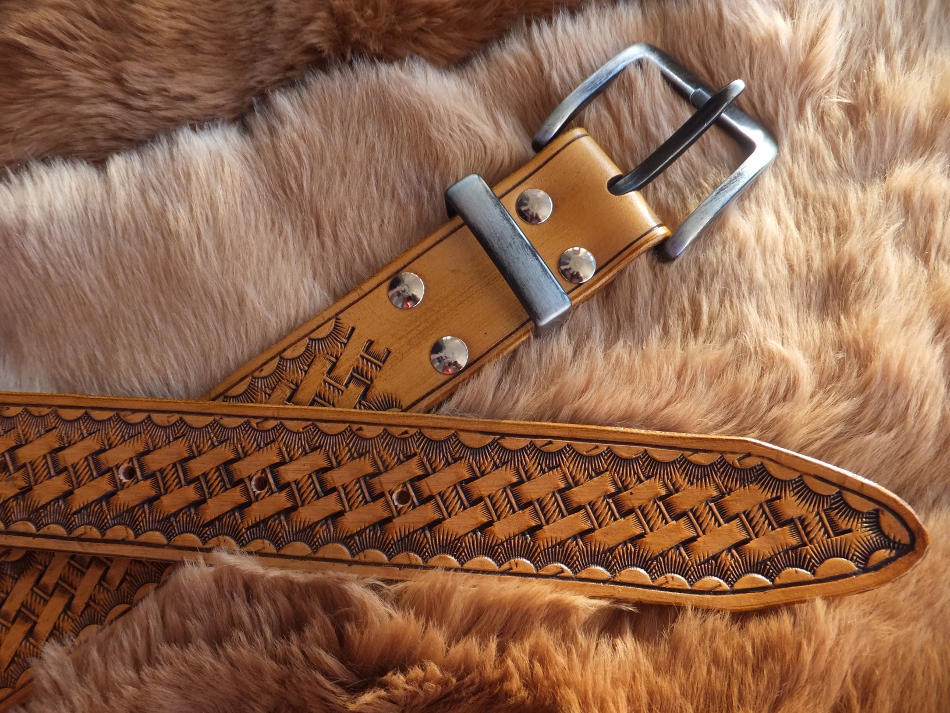 Světle hnědý kožený opasek s kontrastní patinou, zdobený razidlem, imitujícím propletený košík s lanem, razidlo je kladeno šikmo. Zadní strana je bez povrchové úpravy – přírodní kůže.