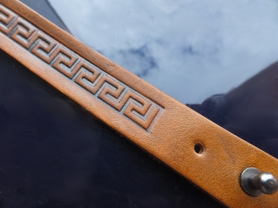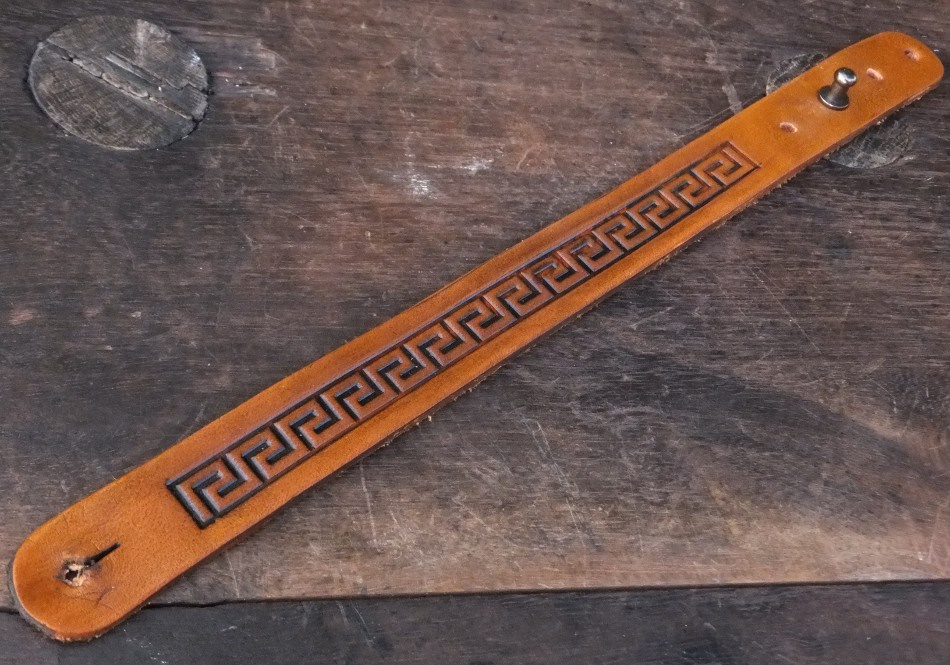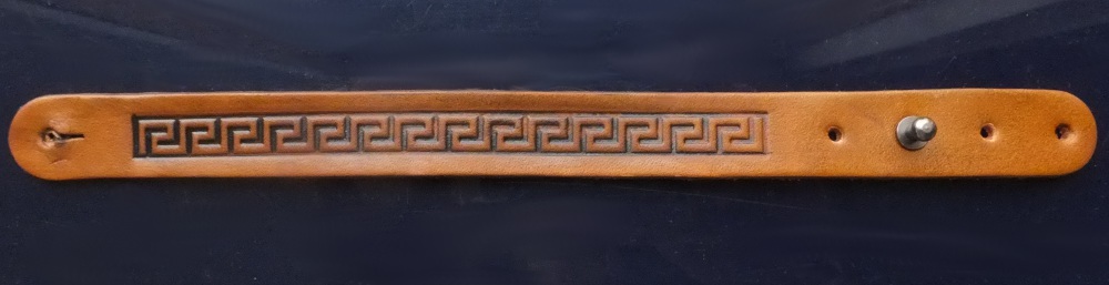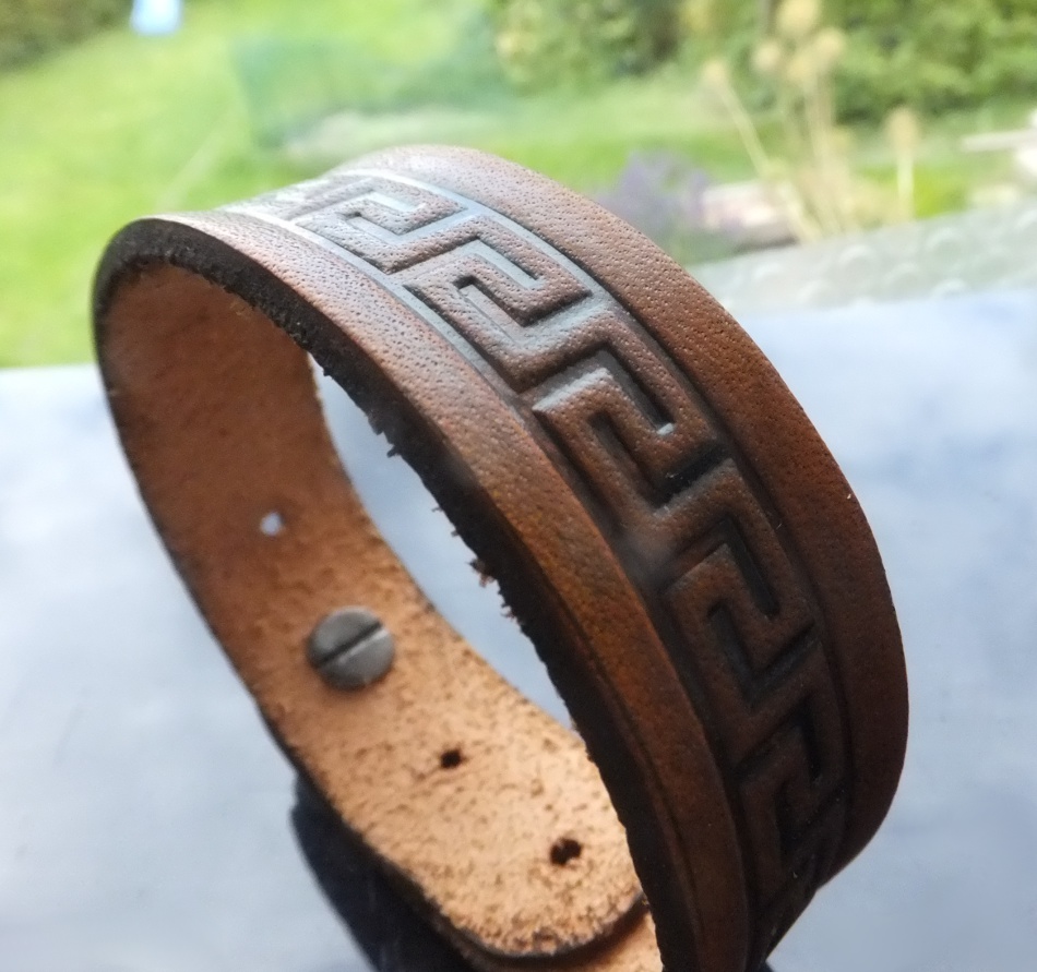 Kožený náramek s hnědou patinou, rozměru 240 x 18 x 2 mm se zapínáním (dá se vyšroubovat a posunout podle velikosti ruky).