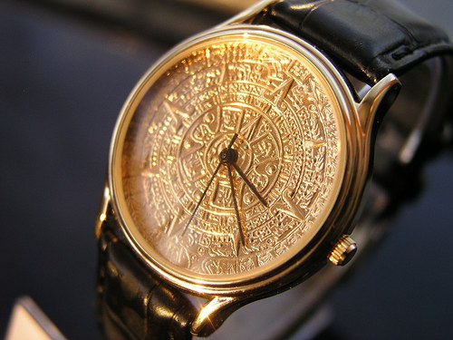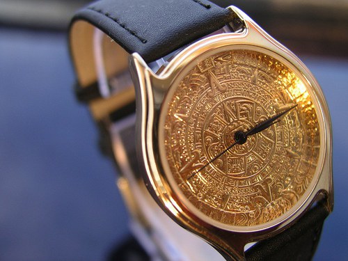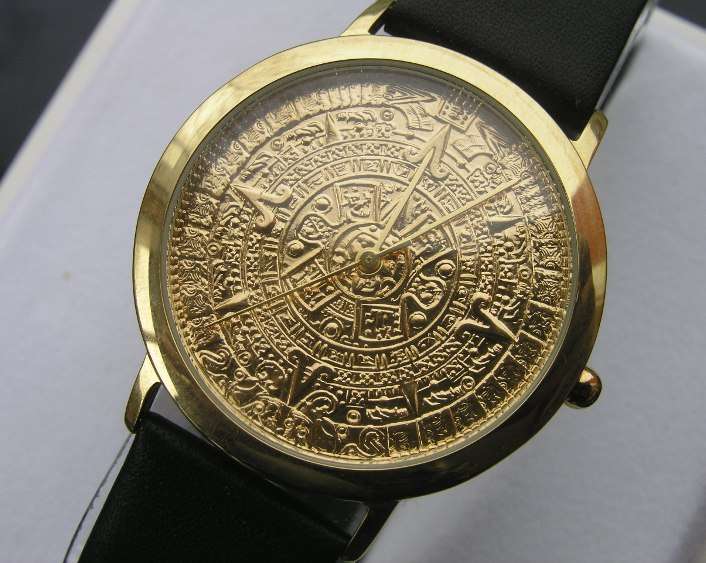 Umělecká ražba ciferníku zpodobňuje Aztécký kalendář. Raženo z ručně rytých raznic.