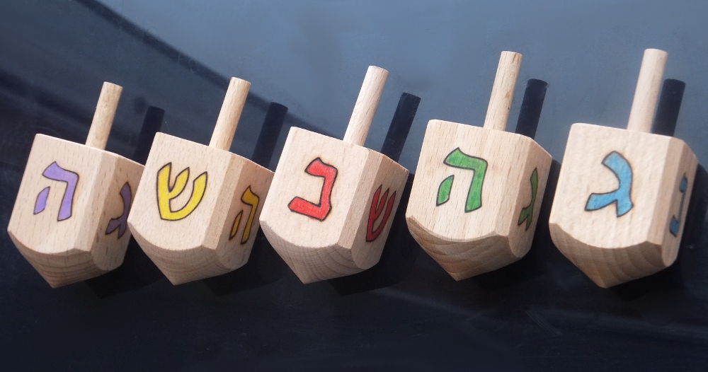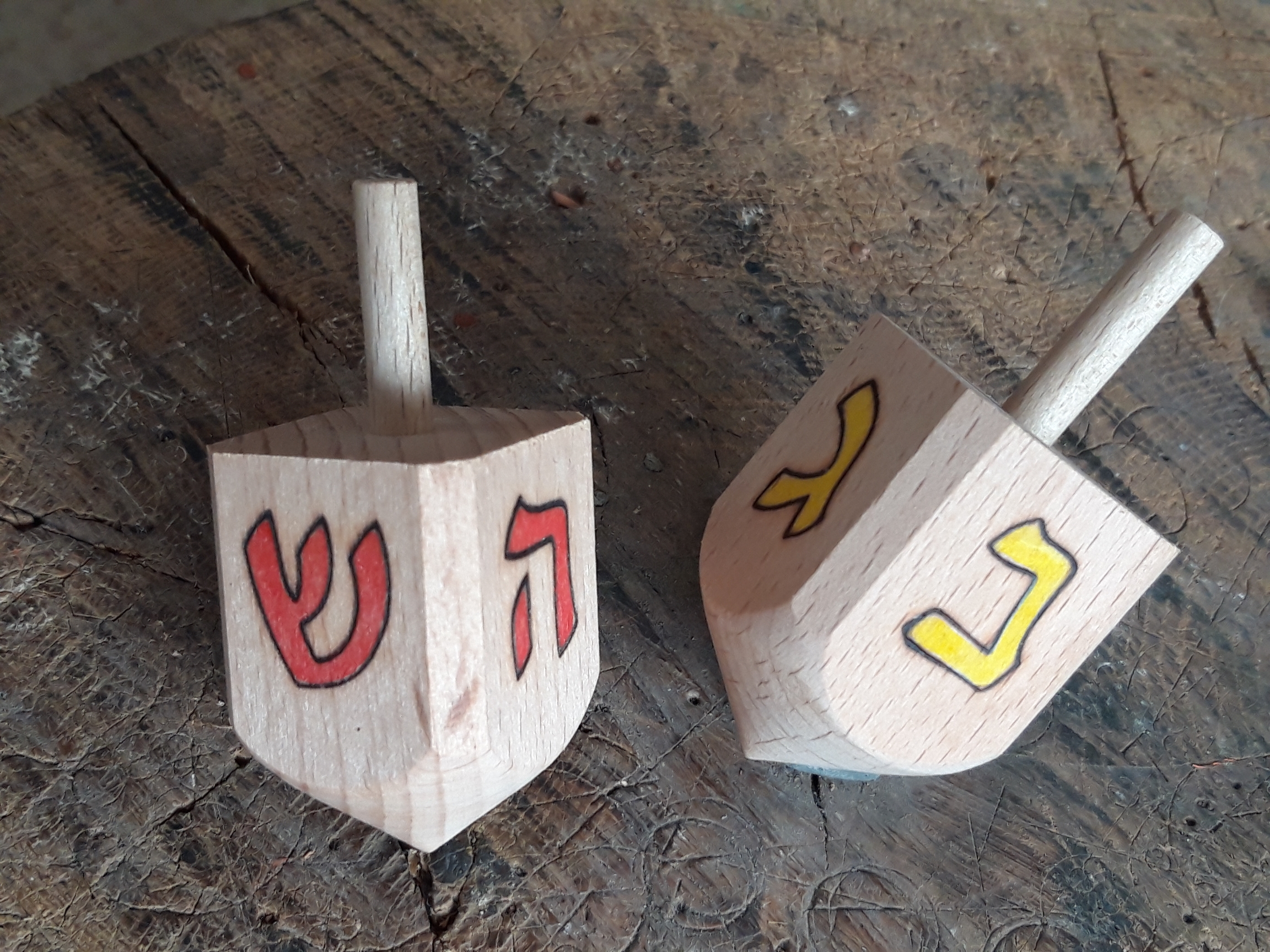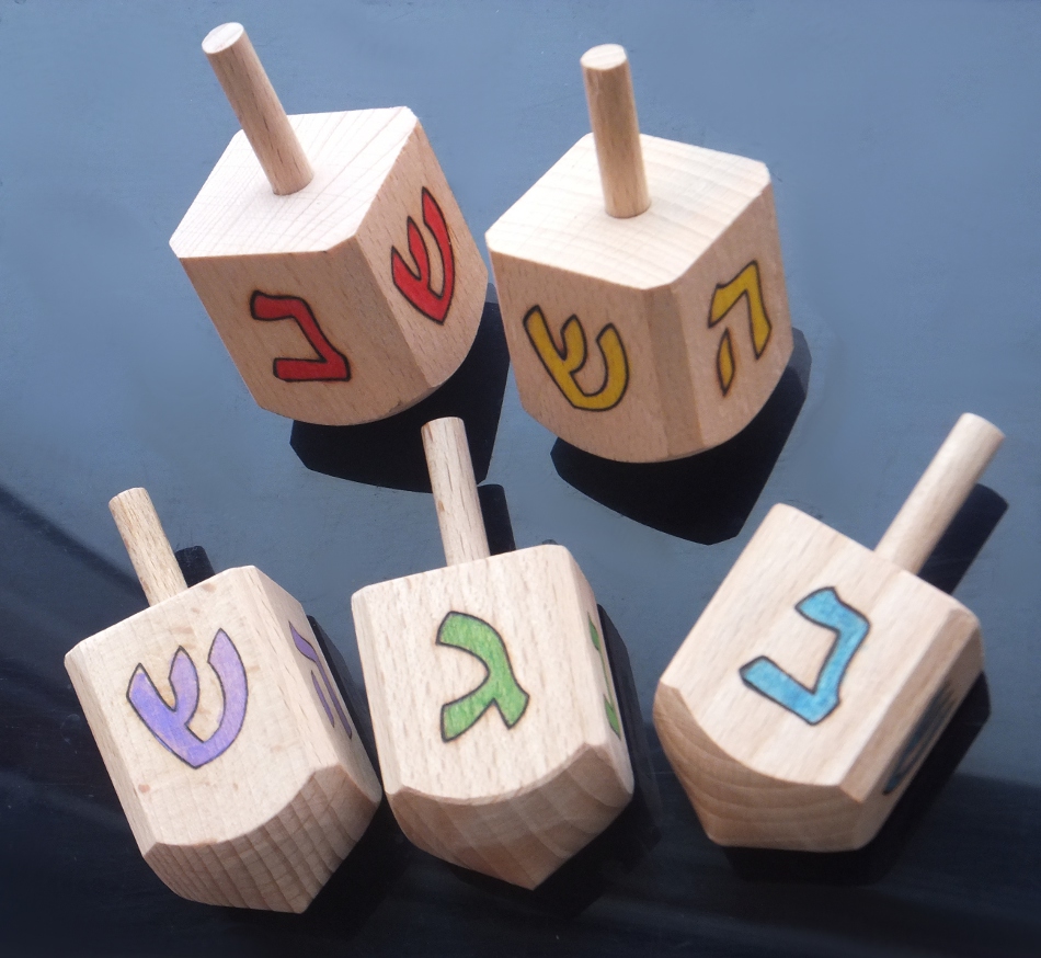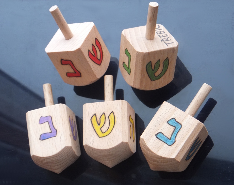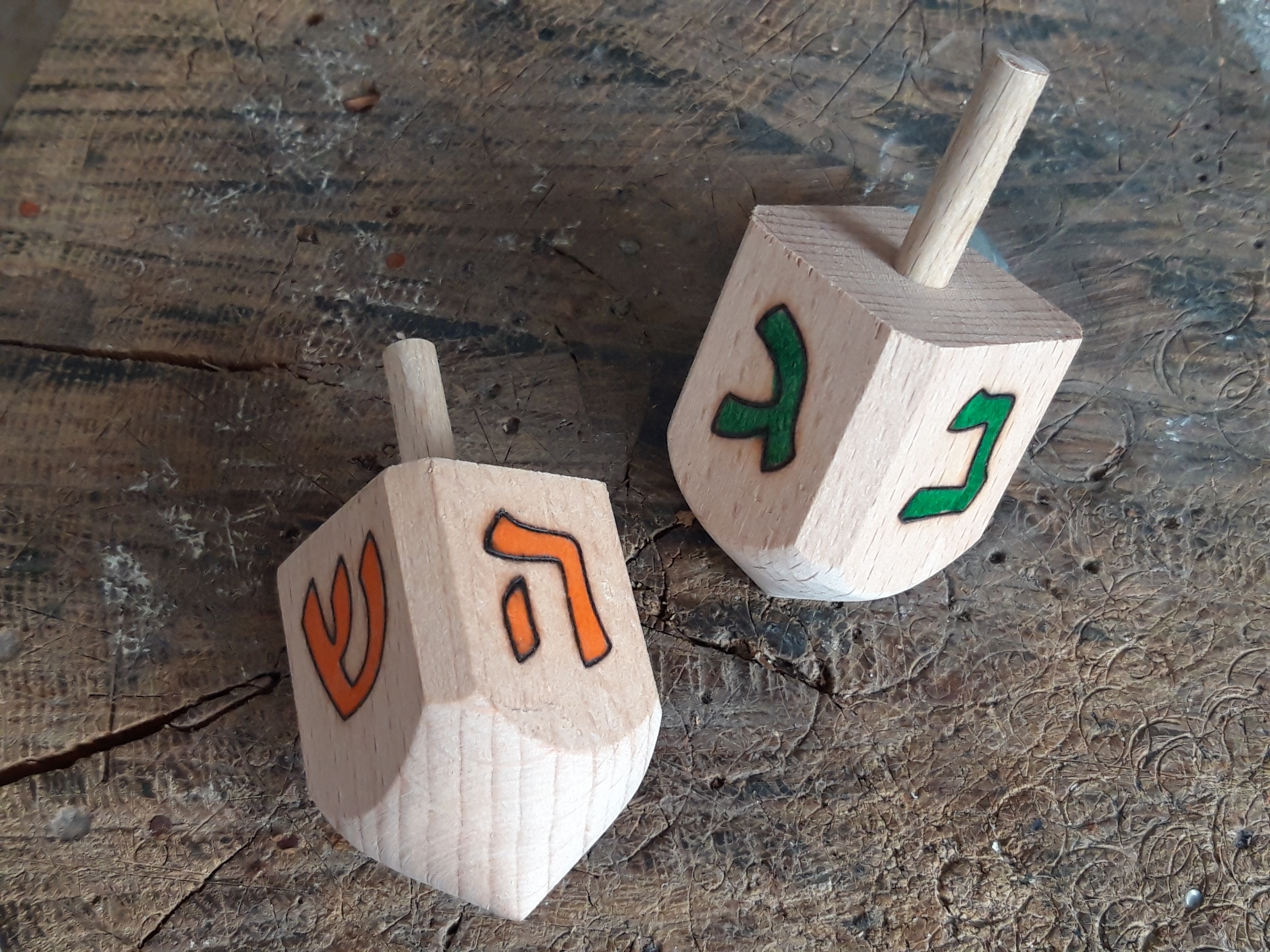 Každá ze čtyř stran nese jedno hebrejské písmeno. Tato písmena tvoří akronym fráze Nes Gadol Haja Šam – „stal se tam velký zázrak“. Kontury písmen vypalujeme do dřeva a ručně kolorujeme. Každý drejdl je proto originál – barevné odstíny dřeva i písma se mohou mírně lišit.