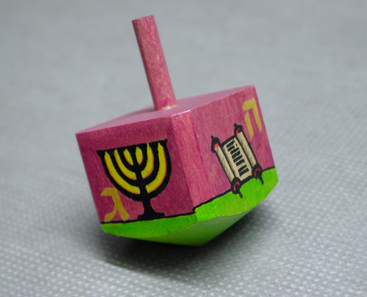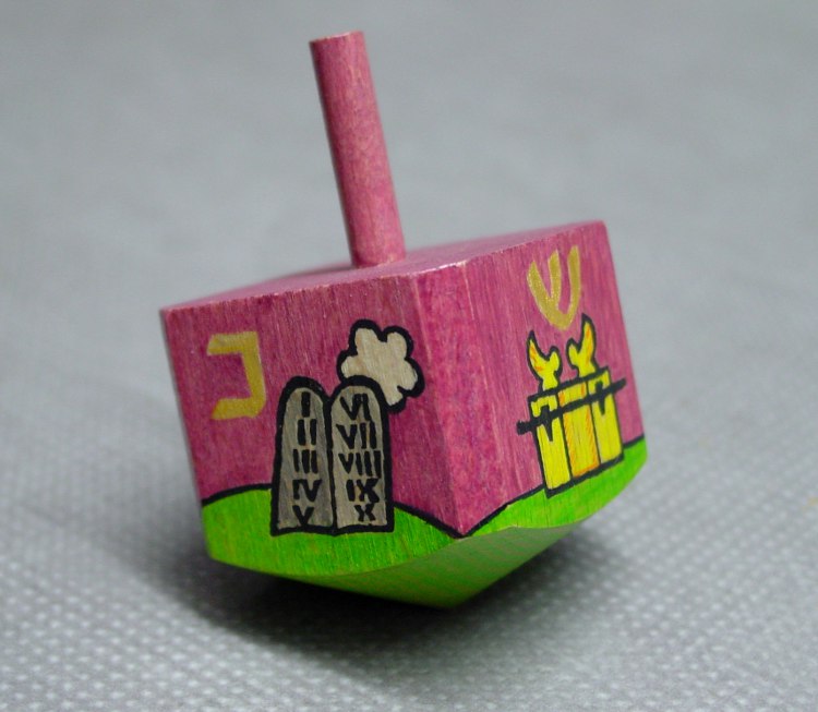 Drejdl velký fialový je stará židovská hračka s hebrejskými písmeny na jednotlivých stranách. Písmena jsem ručně napsala zlatou barvou a pomalovala starozákonními symboly.