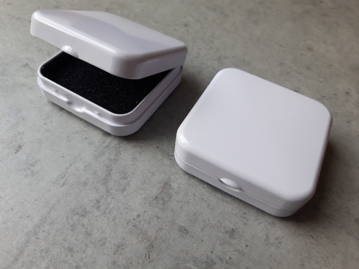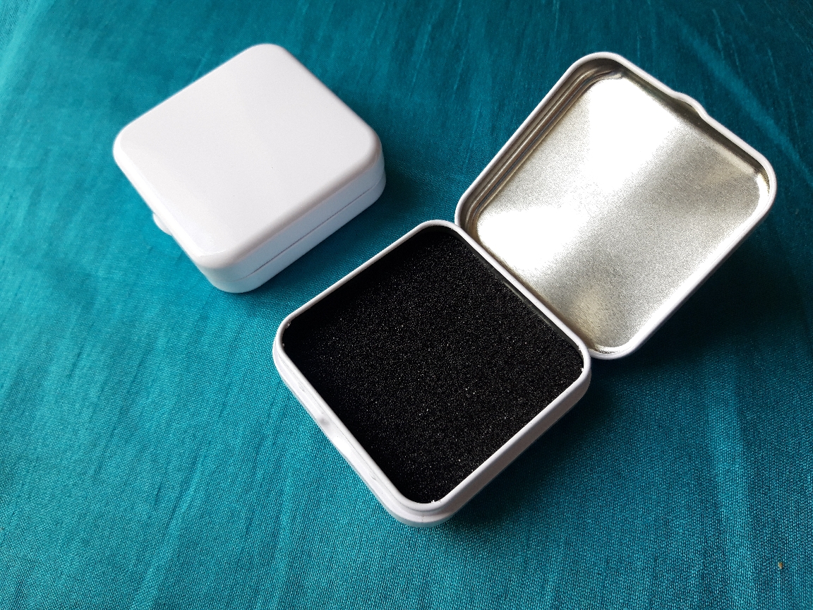 Kovová krabička pro vhodné balení drobných výrobků a mincí v kapsli quadrum.