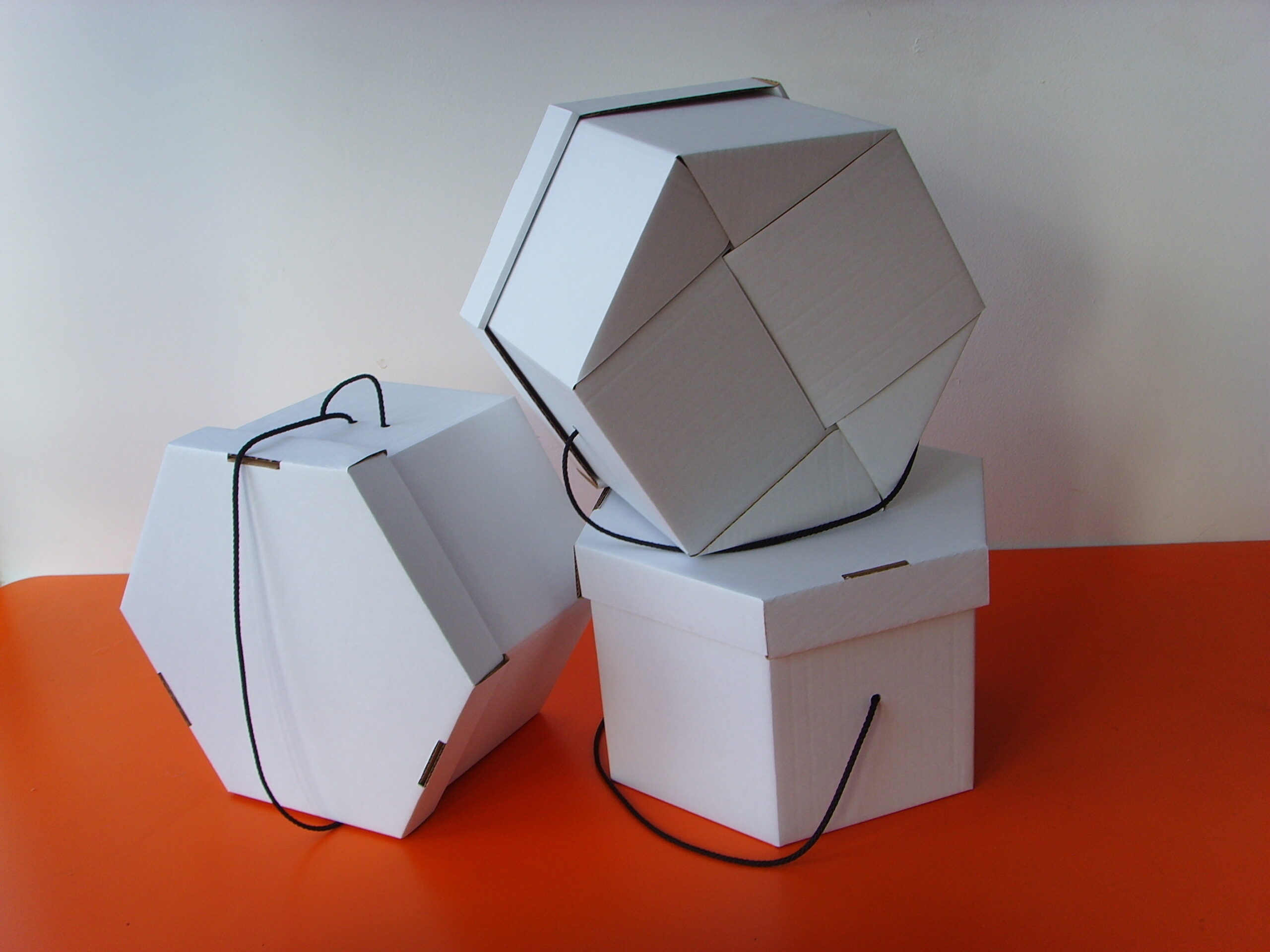 Materiál – vlnitá lepenka, povrch bílý, uvnitř hnědá + černá šňůra na nošení. Výška je 20,5 cm bez víka, průměr je 28 cm (od rohu k rohu 32 cm), boční délka je 16,5 cm. Cena je za 3 kusy.