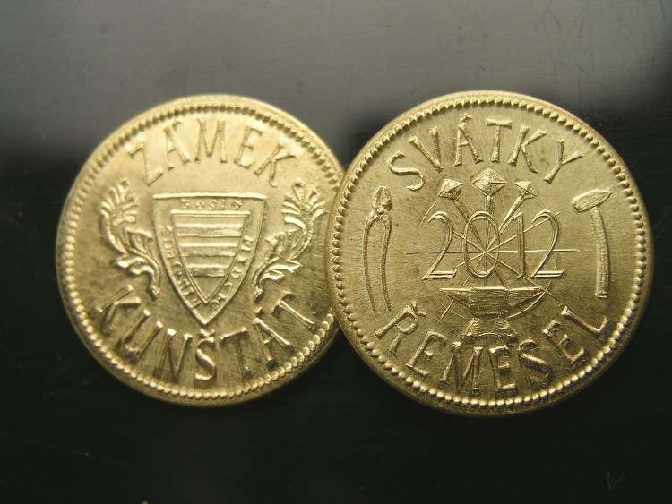 Novoražba pamětní mince pro Státní zámek Kunštát, vydána ke svátku řemesel ve znamení kovu ve dnech 9.-10. 6. 2012. Mosaz, průměr 25 mm.