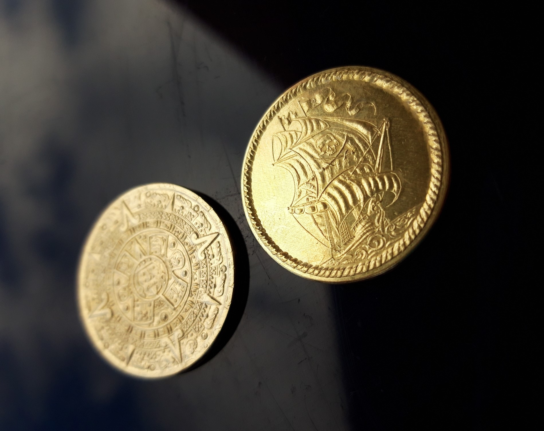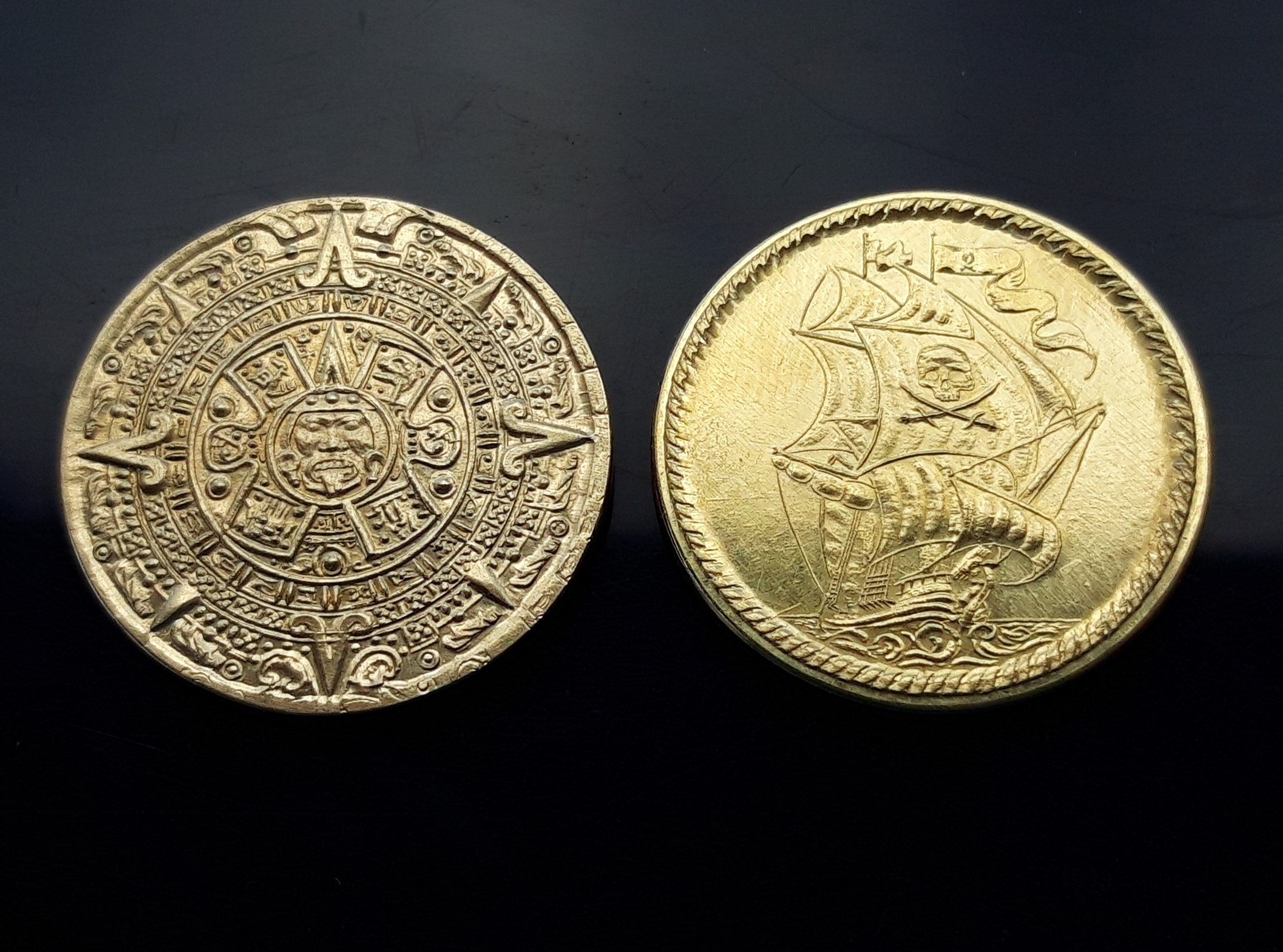 Námořnická pirátská mince Aztec je autorskou fantazijní mincí s motivem Aztéckého kalendáře a pirátské lodi, mexického pokladu.