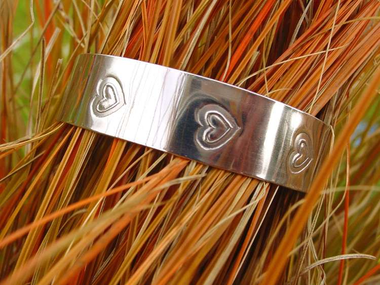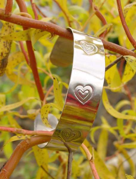 Nerezový náramek s plasticky lisovanými srdíčky pomocí vlastnoručně vyryté raznice. Materiál leštěná nerez. Šířka 16 mm, dá se roztáhnout nebo zmáčknout, podle velikosti ruky.