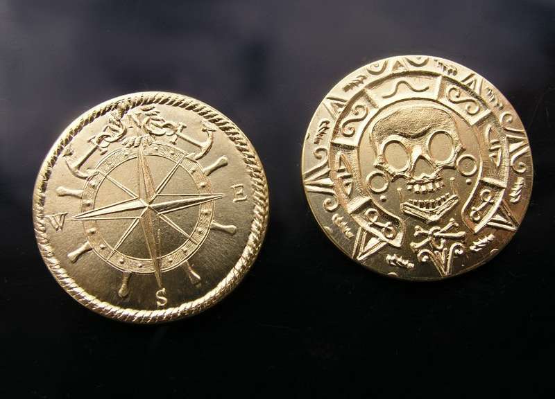 Novoražba autorské mince s pirátským motivem v barvě zlata.