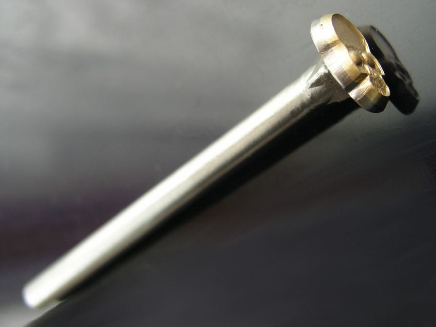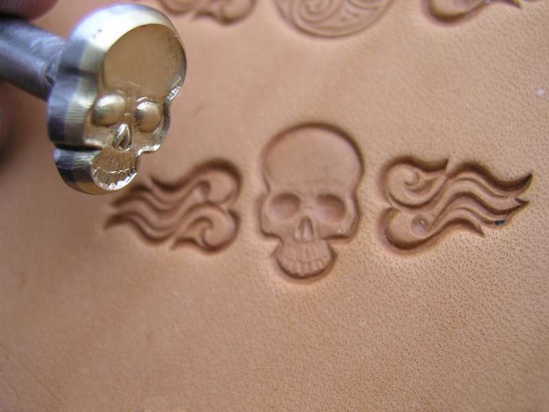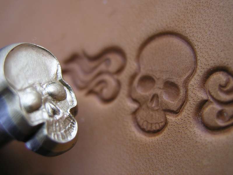 Plastické ruční razidlo s motivem lebky, zhotovené z mosazi a pevně spojené s ocelovým trnem. Velikost otisku je 11 x 17 mm, velikost celého nástroje je 100 x 19 x 13 mm. Možnosti využití jsou velmi široké – kůže, lepenka, rozžhavené sklo, modelovací hmoty…