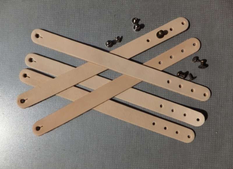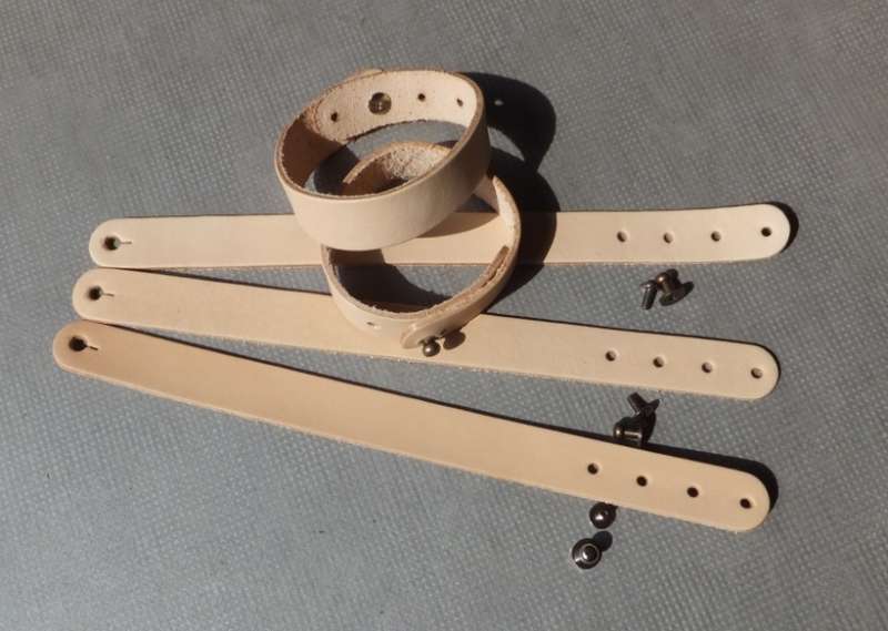 Sada na tvoření náramků 5 ks – sada pěti polotovarů pro výrobu vlastních kožených náramků. Balení obsahuje 5 kožených výseků a 5 párů šroubků na připnutí, rozměr polotovaru je 240 x 18 x 2 mm .