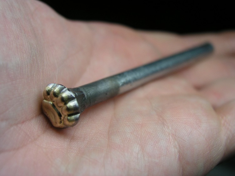 Stopa Teddy razidlo do kůže jsme vyrobili plastickým ručním rytím s motivem tlapky medvídka Teddy. Tento nástroj do kůže jsme vyrobili z mosazi a pevně spojili s ocelovým trnem. Velikost otisku je 10 x 12 mm, velikost celého nástroje je 100 x 12 x 14 mm. Možnosti využití jsou velmi široké – kůže, lepenka, rozžhavené sklo, modelovací hmoty…