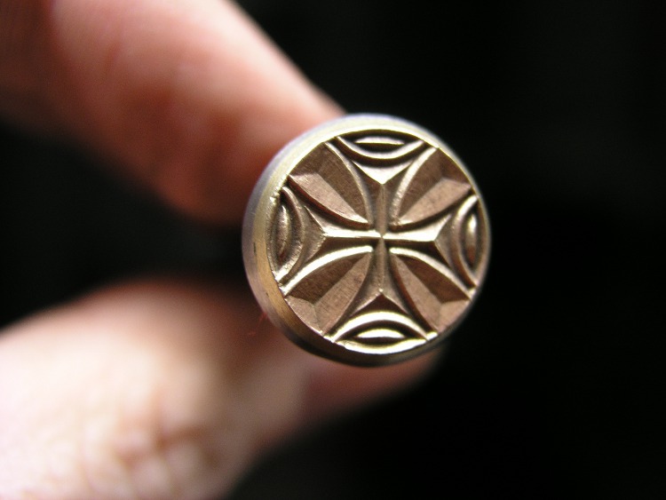 Templářský kříž v kruhu je ruční razidlo do kůže s plastickým motivem latinského či templářského kříže. Průměrná velikost otisku je 14 mm. Reliéf z mosazi jsme připevnili na ocelový trn s držákem. Velikost celého nástroje je 100 x 15 x 15 mm. Razidlo využijte při ražbě do kůže, lepenky i k otiskování do skleněných perel (do rozžhaveného skla), dále do měkkých modelovacích hmot jako je keramická hlína nebo fimo.