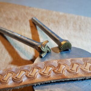 Košík a vějíř 2 razidla – sada dvou razidel do kůže s motivy pletence košíku a vějíře, ze kterých jde kombinovat zajímavý ornament. Razidla je možné použít i samostatně, vějíř na doplnění jiných motivů či tvorby okraje a košík na celoplošné zdobení. Motivy jsou z mosazi na ocelovém trnu. Velikosti otisků jsou 11 x 11…